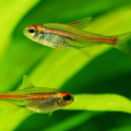 グローライト・テトラ(10匹) ■学名 : Hemigrammus erythrozonus ( Durbin,1909 ) ■流通名 : Glowlight Tetra、Fire Neon ■原産 : ギアナ ■サイズ : 約1~2cm ■適水温 : 24~28℃ ●体中央に走るオレンジ色のラインが特徴の、美しい小型のテトラです。 ●飼育はカンタンで、初心者の入門魚にオススメです。 ●他のテトラと同じく、餌(エサ)は控えめにしてください。わりとスグ肥満体になります。 ●群泳の美しさは素晴らしいです。 ●繁殖もカンタンです。