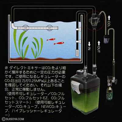 ■このダイレクトミキサーは、CO2をナノレベルの状態で、ダイレクトにホースの中に入れますので、高い添加効率を実現しています。単にホースの中に大きな気泡のままCO2を添加したのとは次元が違います。 ■設置方法は簡単で、外部式フィルターのホースの途中につなげるだけです。 ■無駄なくCO2を添加できますので、CO2の節約にもなります。 ■内径12mm/外径16mmのホースに適合します。 ※ご注意※ ・このダイレクトミキサーは、ナノレベルまでCO2を細かく撹拌するために、ご使用になるレギュレーターのCO2吐出圧力が0.25Mpa以上ある事が必要です。これ以下では、正常に稼働しません。 ・この商品には、逆流防止機能が無い為、別途、逆流防止弁が必要です。 ・CO2の添加量を測る為に、カウンターが別途、必要になります。