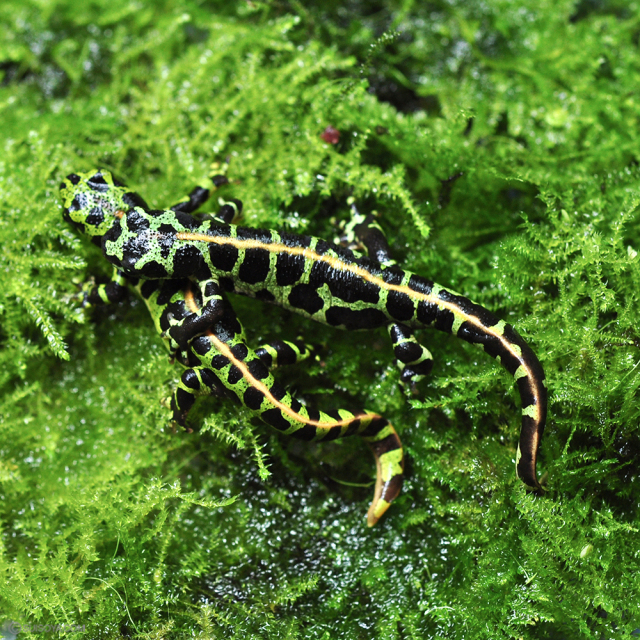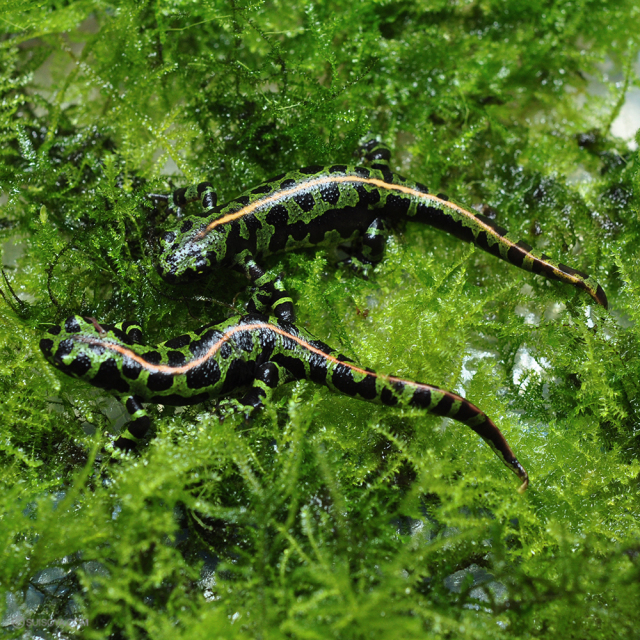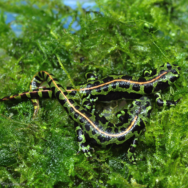緑色と黒色のまだら模様の中にオレンジのラインの入る綺麗な陸生イモリです。