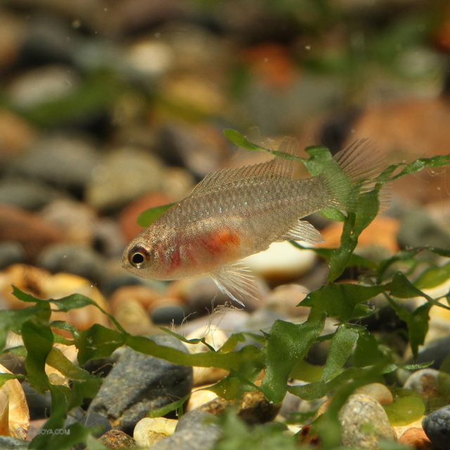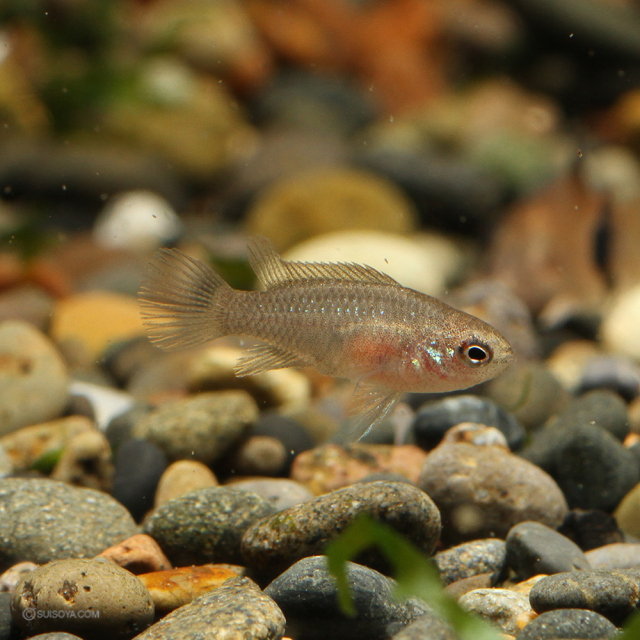 スカーレットジェムの稚魚はオスもメスも赤い線が入っておらず、すべてメスのように見えます。今回はこのほとんど赤い線の入っていない段階の個体から性別の選別をせずに販売となります。