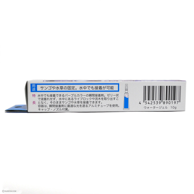 ■水中でも使用できるパープルカラーの瞬間接着剤。ゼリー状で液垂れせず、水中にある素材を取り出す必要が無くそのままサンゴや水草を接着できます。